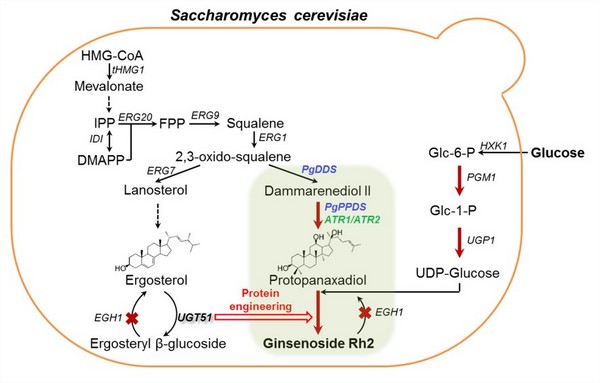 人参皂苷Rh2是药用植物人参中的关键活性组分,具有良好的抗癌、抗氧化活性,在治疗肿瘤、心脑血管疾病等方面具有重要的应用潜力。然而由于人参栽培周期长(5-6年)以及Rh2含量低(0.001%),很难实现规模化生产。应用合成生物学理念,在酵母中构建人参皂苷Rh2的高效合成体系一直是研究热点之一。其中,如何有效发掘、设计和优化关键催化元件-糖基转移酶,以提高人工合成途径适配性等是亟需解决的关键科学问题。