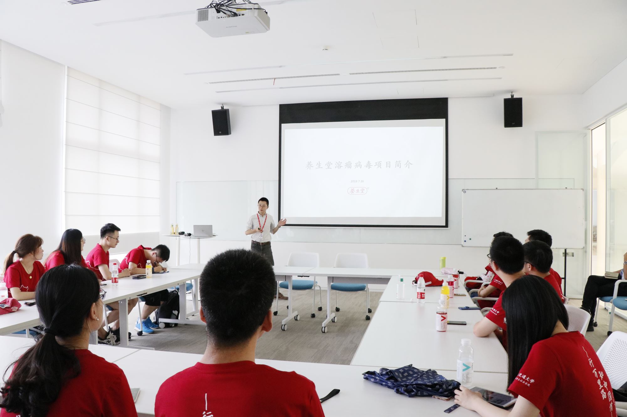 在午休时段,养生堂集团人力资源工作负责人彭琴带领实践团参观了总部园区。午休后,溶瘤病毒项目组代表张悦炜为同学们进行项目讲解,养生堂集团双浦新区建设工作负责人施炜介绍了双浦新区的功能定位和建设计划。随后,实践团成员在工作人员引导下参观了养生堂集团研发中心。参观结束后,养生堂研发项目经理邢庆超和天然药物研究所基础研究部管培生王威与实践团成员进行交流。