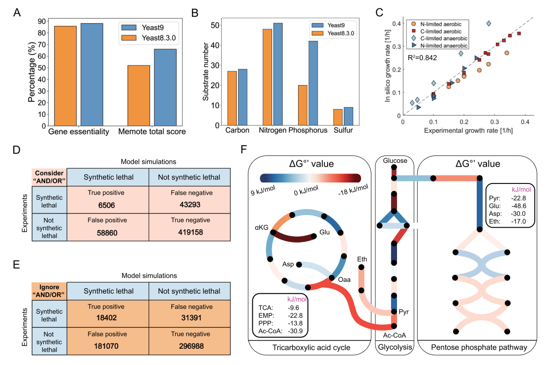图2.对Yeast9预测能力的系统性评估。Yeast8与Yeast9在预测基因必需性及Memote评分之间的比较(A)。Yeast8与Yeast9在碳源、氮源、磷源和硫源利用方面的对比 (B)。在有氧和无氧条件下的生长模拟 (C)。Yeast 9能根据“与/或”的关系预测两个基因组合的合成致死性后果,准确率达到80% (D)。忽略“与/或”的关系,Yeast9在预测合成致死性方面的准确率为59% (E)。TCA、EMP和PPP中的ΔG°’概况。颜色表示ΔG°’的值。红线意味着反应在热力学上是可行的;蓝线表明反应在热力学上是不可行的。粗边圆角矩形内的数字代表从葡萄糖合成乙酰辅酶A、丙酮酸、谷氨酰胺、天冬氨酸和乙醇时TCA、EMP、PPP及相关反应途径的总ΔG°’(F)。
