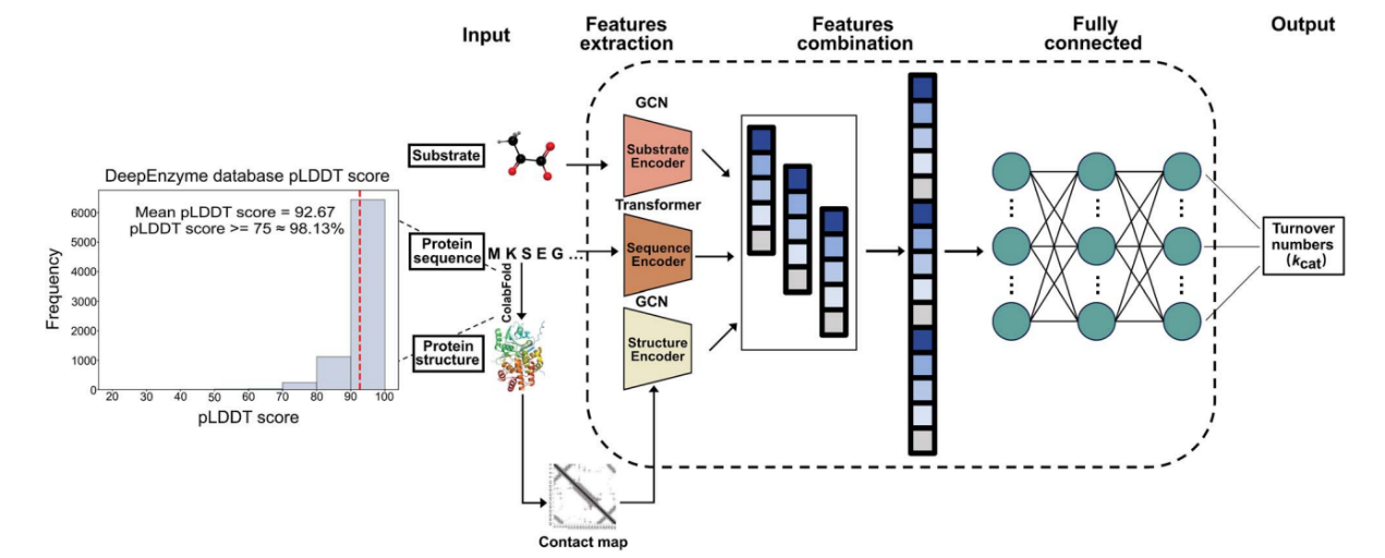图3.DeepEnzyme用于预测kcat的框架。DeepEnzyme整合了变换器和图卷积网络(Graph Convolutional Network,GCN)模型,从酶和底物中提取特征以预测kcat值。GCN用于根据蛋白质三维结构和底物邻接矩阵提取结构特征;变换器则用于从蛋白质序列中提取序列特征。