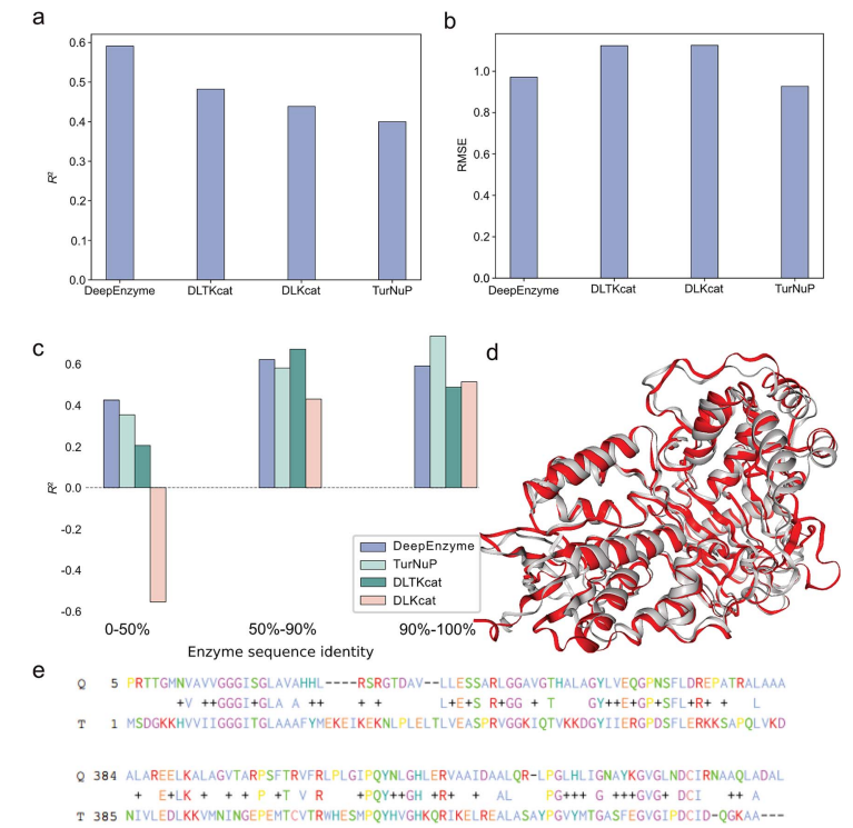 图4.DeepEnzyme 在kcat预测中的性能相比现有模型有所提升,即使对于测试数据集中的蛋白质序列与训练数据集中的序列相似度较低的情况也是如此。不同模型在测试数据集上的R2值比较 (a)。不同模型在测试数据集上的RMSE值比较 (b)。DeepEnzyme、TurNuP、DLkcat和DLTkcat在测试数据集中不同序列相似度水平下对酶的kcat值预测的R2比较 (c)。来自黏质沙雷氏菌和枯草芽孢杆菌的两种酶,它们的EC编号均为1.3.3.4,在蛋白质三维结构上高度相似(TM score = 0.8762),其中黏质沙雷氏菌的酶用灰色表示,枯草芽孢杆菌的酶用红色表示 (d)。上述两种酶的氨基酸序列相似度为27%(Q表示来自黏质沙雷氏菌的酶,T表示来自枯草芽孢杆菌的酶) (e)。