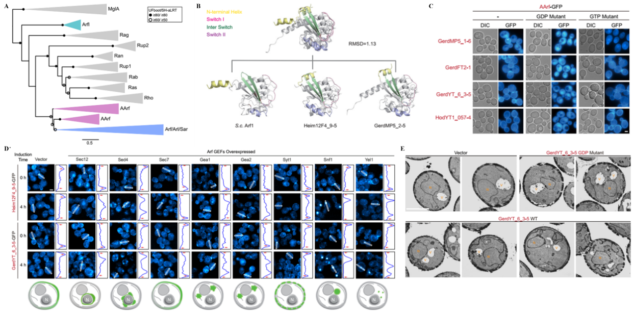 本研究通过生物信息学分析,发现Asgard古菌中存在一类与真核细胞Arf GTPase结构和功能类似的蛋白质,命名为AArfs。细胞体内和体外的实验表明,AArfs能以GTP依赖的形式将N端两亲性螺旋结构域锚定到膜结构上,并调节细胞内膜系统的形态,引发内质网和高尔基体等细胞器的增殖。当与真核生物Arf调控因子(GEFs/GAPs)共表达时,AArfs不仅与这些调控因子发生亚细胞共定位,其膜结合形式也发生改变。进一步,免疫共沉淀与质谱结果表明,GTP结合的AArfs能特异性识别COPII囊泡核心组分Sec23,提示其可能通过招募下游效应蛋白调控膜动态。该研究为解析真核生物复杂内膜系统的进化起源提供了关键线索。AArfs或代表真核细胞器生成机制的进化起点,能够驱动细胞器膜形变,这也是真核生物进化过程中的关键一步,在长期进化过程中逐步演化形成现代真核细胞高度复杂的内膜网络系统。